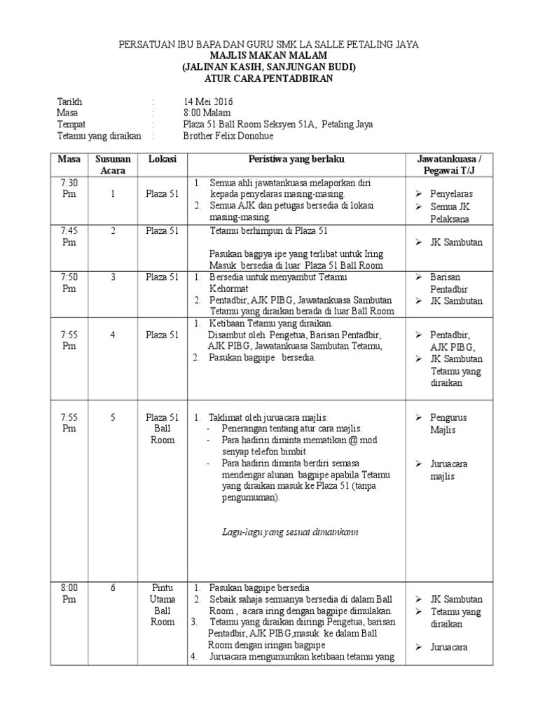 Break, dinner, dont rush, at dinner, . Contextual translation of aturcara majlis makan malam untuk syarikat into english. Tempat duduk vip mengikut protokol; Muat turun koleksi template buku program acara di . Majlis bermula 7.40 pm : Buku aturcara majlis makan malam 2019. Aturcara untuk majlis makan malam graduasi tingkatan 6 sesi 2015/16 maktab sabah tahun 2017. Kad jemputan perkahwinan misalnya merupakan utusan pertama yang akan bersama tetamu jemputan. 1030 hrs, mesyuarat jawatankuasa kerja tertinggi cuepacs. 5 aturcara majlis makan malam alumni.